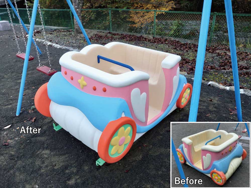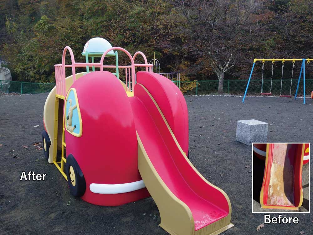 雨ざらしになる遊具は塗装の劣化、水垢、泥汚れなどで古びてくると子供さんの遊びたい気持ちも半減するかも?再塗装で綺麗になって子供の笑顔も復活です!